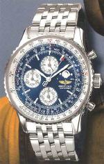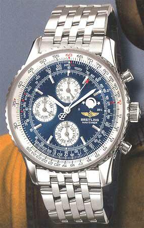 Größe: Herren, Kaliber 19, Mechanisches Uhrwerk mit Automatikaufzug, Gehäuse Stahl, 43mm Durchmesser, Saphirglas, Navitimerband Stahl, Funktionen: Stunde, Minute, Sekunde aus der Mitte, Datum, Chronograph, Schaltjahrkalender (Tag, Monat, Mondphasen), Boden verschraubt, Wasserdicht bis 3 Bar, Volle Hersteller-Garantie für 2 Jahre