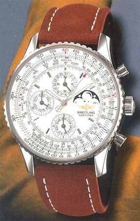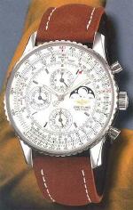 Größe: Herren, Kaliber 19, Mechanisches Uhrwerk mit Automatikaufzug, Gehäuse Stahl, 43mm Durchmesser, Saphirglas, Armband aus Leder, Funktionen: Stunde, Minute, Sekunde aus der Mitte, Datum, Chronograph, Schaltjahrkalender (Tag, Monat, Mondphasen), Boden verschraubt, Wasserdicht bis 3 Bar, Volle Hersteller-Garantie für 2 Jahre